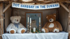 sukkah with stuffed bears, the bear on the left is white, and there are 2 candlesticks, and a banner that reads _Tot Shabbat in the Sukkah_